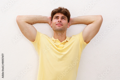 adult, attractive, background, beautiful, behind, casual attire, caucasian, cheerful, confident, contemplation, cool, enjoy, enjoyment, expression, face, fashion, fashionable, guy, hand, photogenic, happiness, happy, head, healthy, isolated, leisure, life, lifestyle, looking, male, man, model, modern, 1, people, person, portrait, real, relax, relaxation, smiling, standing, style, stylish, thinking, wall, white, young