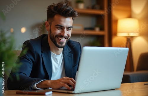 Young man smiling working on laptop at home. Dressed in dark blazer, white t-shirt, focused on computer. Paperwork, smartphone visible on desk. Background shows bookshelf, lamp, creating warm, home