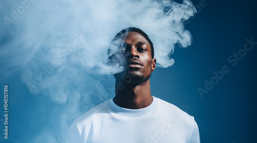 Young Man Standing Amidst Blue and White Smoke in a Dramatic Scene. Beautiful man. Mens Healthcare. Creative art