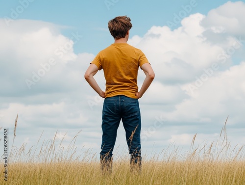 Young man standing in an open wheat field with his back to the camera wearing a casual t shirt symbolizing solitude reflection and freedom in nature