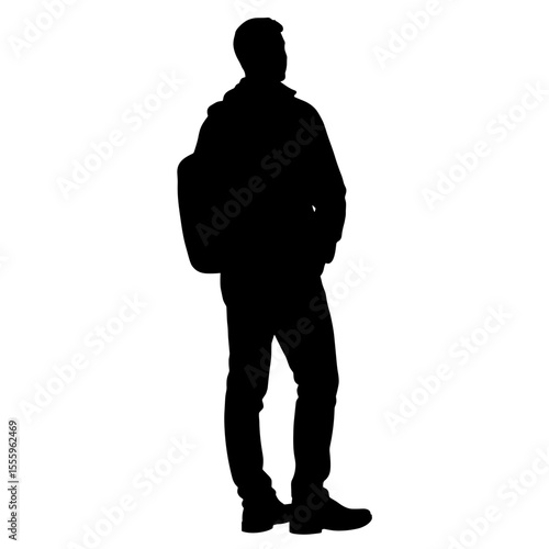 man, silhouette, standing, backpack, profile, casual attire, black, figure, clothing, lifestyle, travel, fashion, posture, male, solo, standing still, isolated, character, anonymity, exploration, youth, tall, slim, dark, strength, adventure, anticipation, journey, modern, sleek, casual clothes, urban, confident, traveler, dynamic, movement, individuality, presence, modernity, solitude, peaceful, expression, identity, confidence, adult, freedom, contrast