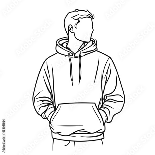 man, young, hoodie, standing, casual attire, minimal, white, outline, sweater, fashion, comfortable, style, youth, clothing, illustration, drawing, monochrome, trendy, cool, edge, fashionable, modern, relaxed, portrait, character, black-and-white, athletic, male, simple, art, casual clothes, confidence, anonymity, unrecognizable, daytime, urban, lifestyle, personal, minimalist, stylish, culture, identity, creative, monochromatic, figure