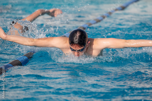 Young man swimming butterfly on a sunny day. Deep blue pool water. Black and blue lane lines. Blue goggles, no swim cap.