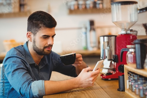 hot drink, text, man, wireless, mobile, office, messaging, lifestyle, casual attire, having, while, phone, mobile phone, cafeteria, communication, refreshment, technology, smartphone, occupation, connection, electronic, workplace, beverage, drinking, photogenic, clothing, leisure, message, holding, service, dialling, sitting, texting, men at work, typing, drink, young, cafes, cup, in, on