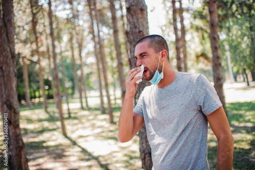 Young man uses tissue paper sneezing due to having allergy. Young man wear face mask and sneezing outdoors