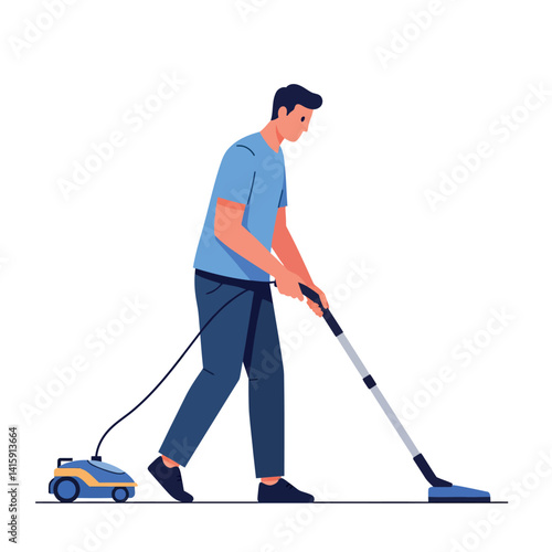 man, person, vacuum, cleaner, blue, shirt, pant, casual attire, home, floor, cleaning, tool, household, domestic, activity, task, indoor, standing, action, electric, device, modern, flat, minimal, simple, vector, digital, art, illustration, character, lifestyle, care, tidy, neat, young, male, single, isolated, object, work, service, clean, equipment, appliance, routine, people