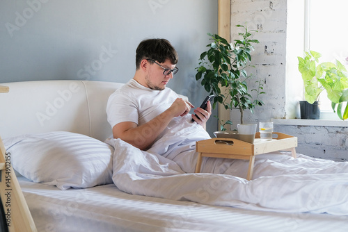 bed, bedchamber, morning, man, breakfast, home, wake up, male, indoor, caucasian, food, young, smiling, drink, people, house, husband, lifestyle, room, tray, meal, background, luxury, smile, service, pillow, photogenic, adult, juice, eating, lying, beverage, hot drink, happiness, tea, cup, healthy, married, relaxation, pajama, resort, romantic, using, play, game, read, phone, mobile