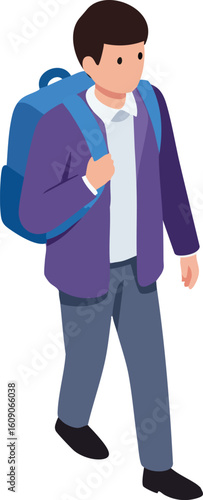 man, young, walking, backpack, casual attire, clothes, urban, style, pedestrian, person, adult, male, fashion, bag, journey, travel, vector, illustration, confident, relaxed, movement, lifestyle, street, outfit, blue, jacket, pant, shoe, hair, character, step, individual, carrying, backpacker, modern, design, leisure, activity, portrait, single, isolated, icon, people, casual clothes, traveler, youth, motion