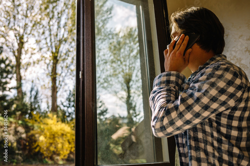 Young man wearing casual clothes talking on a mobile phone in the morning at a window with copy space,