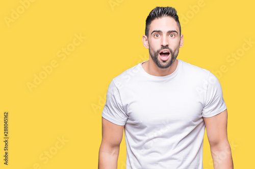 Young man wearing casual white t-shirt over isolated background afraid and shocked with surprise expression, fear and excited face.