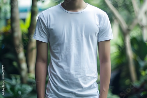 Young man wearing white tshirt for mockup on blurred bokeh background.