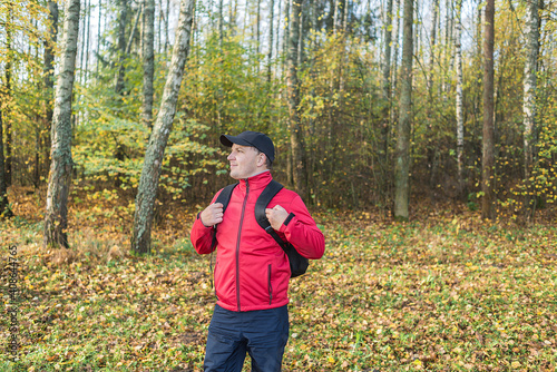 Young man with a backpack walks through the forest. Travel theme. Young man with a backpack walks through the forest