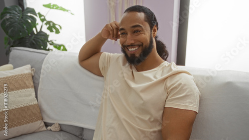 Young man with beard smiling in living room seated on sofa with indoor plant pillow decor and relaxed ambiance light streaming from window.
