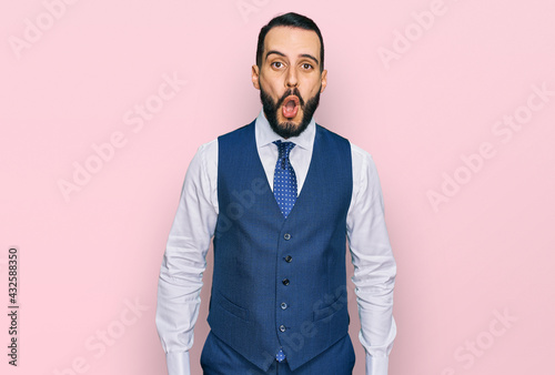 Young man with beard wearing business vest afraid and shocked with surprise expression, fear and excited face.