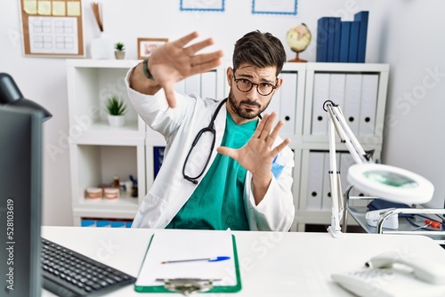 Young man with beard wearing doctor uniform and stethoscope at the clinic doing frame using hands palms and fingers, camera perspective