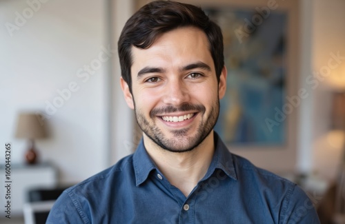 Young man with charming smile wears blue shirt indoors office. Friendly pro portrait conveying warmth, approachability, confidence. Casual attire signals positive workplace interaction, successful