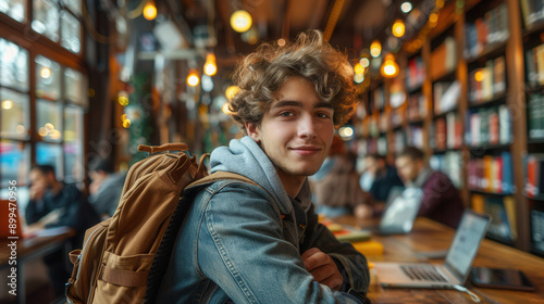 Young Man with Curly Hair Studying in a Cozy Cafe, Surrounded by Books and Warm Lighting, Embracing Knowledge and Education
