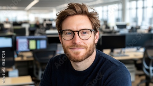 young man with light brown hair and glasses smiles confidently at the camera in a contemporary office setting