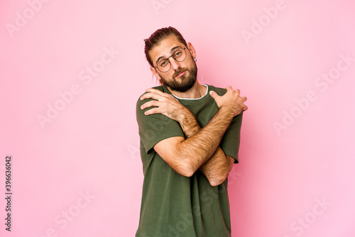face, portrait, pink, casual attire, man, person, background, caucasian, isolated, young, male, attractive, long hair, adult, guy, hugging, self, love, yourself, care, happy, smiling, satisfied, comfortable, proud