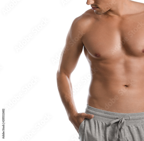 Young man with slim body on white background, closeup view