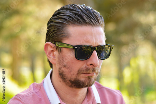 Young man's outdoors portrait looking at the camera who has sunglasses with natural green background. Neutral, happy, sad, disgust, fear, surprise Facial Emotion.