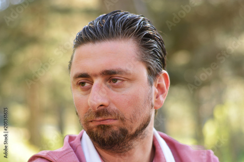 Young man's outdoors portrait looking at the camera with natural green background. Neutral, happy, sad, disgust, fear, surprise Facial Emotions.