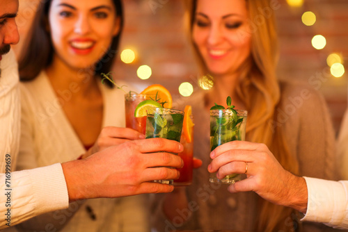young, man, woman, drinking, cocktail, alcohol, party, holiday, celebration, event, drink, bar, home, smiling, fun, red, green, rum, gin, vodka, mojito, mint, orange, happy, success, soft, youth, festive, friends, friendship, toast, cheer, evening, pub, tradition, people, beverage, club, beautiful, christmas, eatery, glasses, person, nightclub, holding, wedding