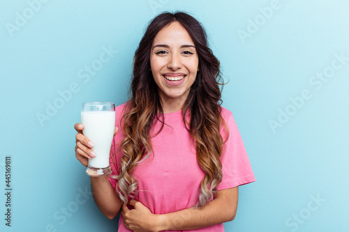 Young mixed race woman holding a glass of milk isolated on blue background laughing and having fun.