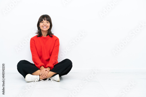 Young mixed race woman sitting on the floor isolated on white background laughing