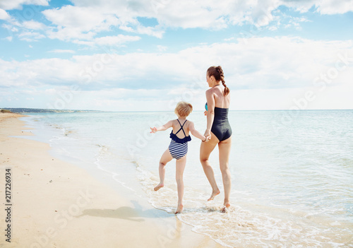 young mother and daughter in swimwear on beach running