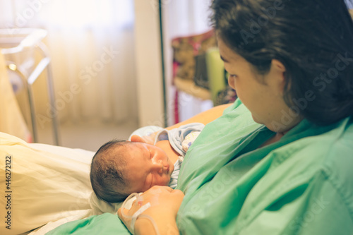 Young mother holding her newborn baby who sleep first days of life at hospital, love and Mother’s Day concept.