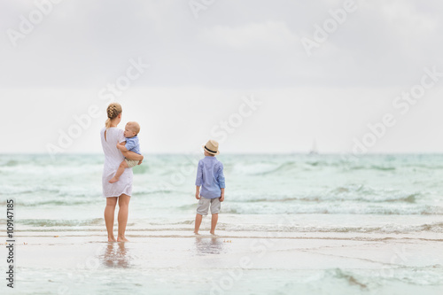 Young mother in white dress walking with her two little boys along the ocean beach. Woman with baby and boy enjoying vacation by the sea. On the empty beach. Motherhood. Water background. copy space.