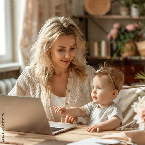 Young mother working from home office having virtual meeting and taking care of baby child daughter, stock photo,