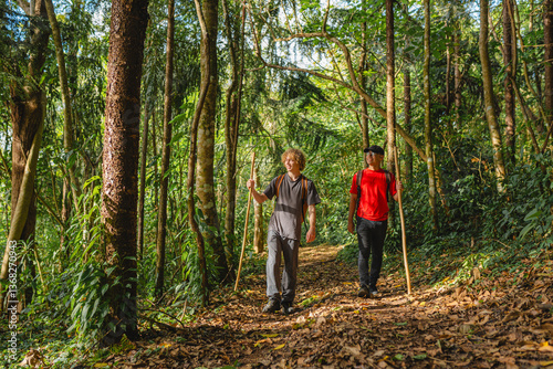 Young multicultural friends walking and enjoying a tropical rainforest in Costa Rica