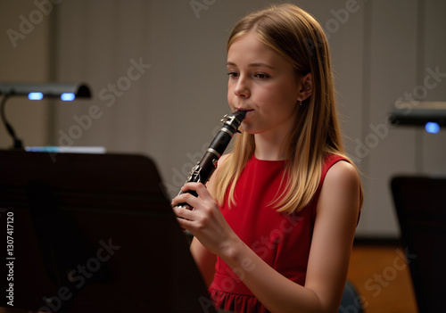 clarinet, music, musician, playing, instrument, girl, young, children, children, orchestra, band, concert, hall, auditorium, rehearsal, performance, practice, classical, woodwind, sound, melody, talent, skill, education, learning, student, school, lesson, teacher, conductor, stage, light, entertainment, hobby, passion, dream, inspiration, creativity, expression, emotion, beautiful, elegant, dress, red, blond, hair, caucasian, female, youth