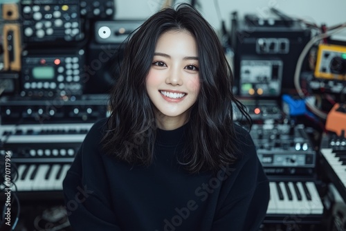 Young musician smiling in a stylish studio surrounded by synthesizers and keyboards