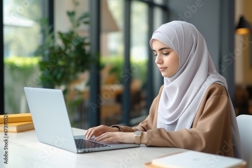 Young Muslim woman in gray hijab sits at a laptop against the background of modern interior.