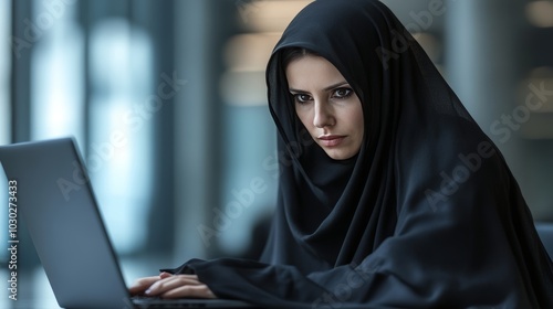 woman, technology, business, laptop, office, work, professional, muslim, islam, faith, cyberspace, computer, typing, communication, online, student, education, learning, cognition, young, adult, female, portrait, concentration, determination, sharpened, skill, career, empowerment, diversity, inclusion, modern, workplace, background, indoor