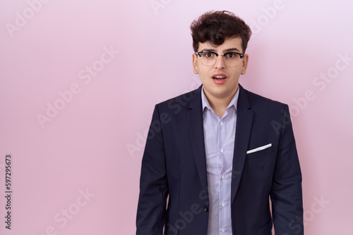 Young non binary man with beard wearing suit and tie afraid and shocked with surprise expression, fear and excited face.