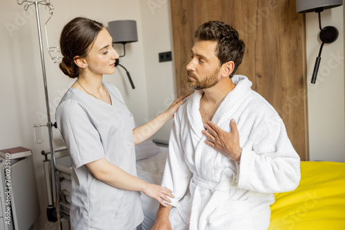 Young nurse takes care of adult man sitting on bed of comfortable medical ward. Medical support and assistance during the rehabilitation in clinic