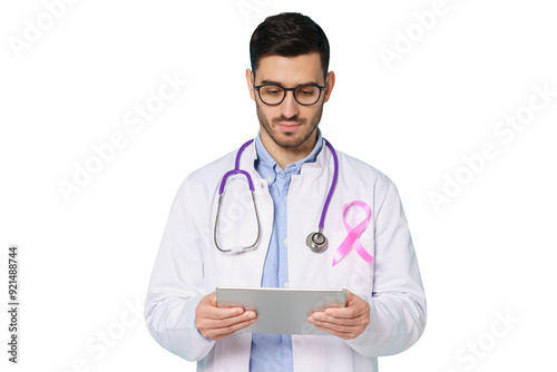 Young oncologist doctor with pink ribbon on his white coat looking at tablet, using app for medical check up. Breast cancer awareness month concept
