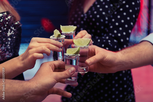 Young people toasting with Mexican Tequila shots in bar, closeup