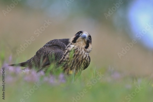 Young peregrine falcon sitting on the ground. Falco peregrinus in the nature habitat.