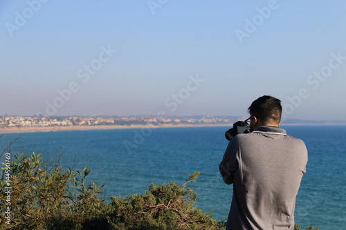 Young photographer making photos of a seascape with his camera