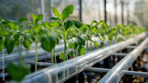 Young plants growing in a hydroponic system inside a greenhouse, showcasing modern agriculture, sustainable farming, and innovative cultivation methods