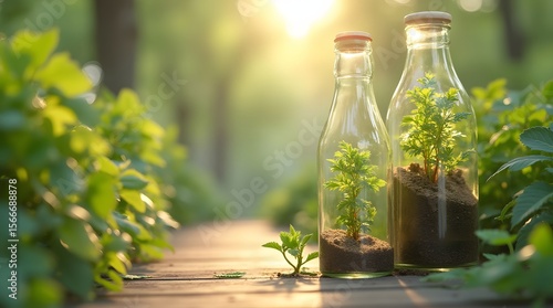 Young plants growing inside glass bottles in a sunlit garden at dawn, showcasing nature's resilience and beauty