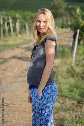 pregnant, expecting, woman, happy, cheerful, nature, smile, motherhood, maternity, vinery, blond, blond, caucasian, lifestyle, summer, path, road, pregnancy, belly, attractive, adult, female, tummy, mother, young, portrait, beautiful, active