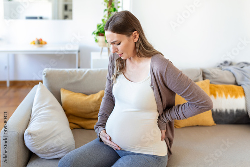 Young pregnant woman suffering from backpain or migraine, feeling sick, sitting on sofa at home, free space. Sad expecting lady touching her big tummy, home alone