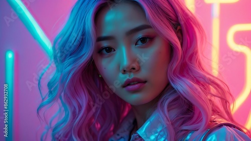 Young pretty Asian woman with glitter make-up wearing sporty fashion, white clothes, model posing isolated on a colorful modern pink and blue background, k-pop style