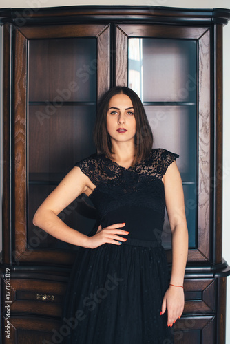 woman, young, beauty, make-up, girl, female, look, cute, brunette, hair, dress, evening, wallpaper, bedchamber, elite, wooden, furniture, cabinet, chandelier, bed, room, black, brown, portrait, hand, length, shoe, mirror, posing, calmness, comfort, cooking, date, smile